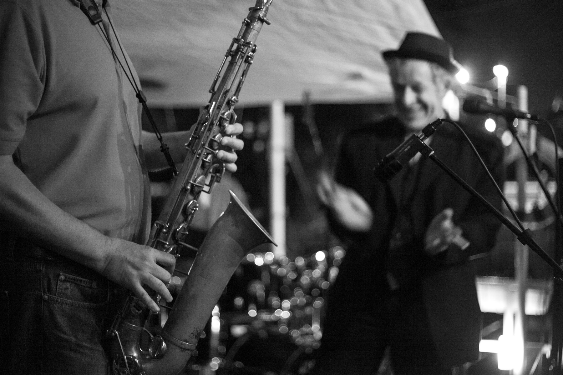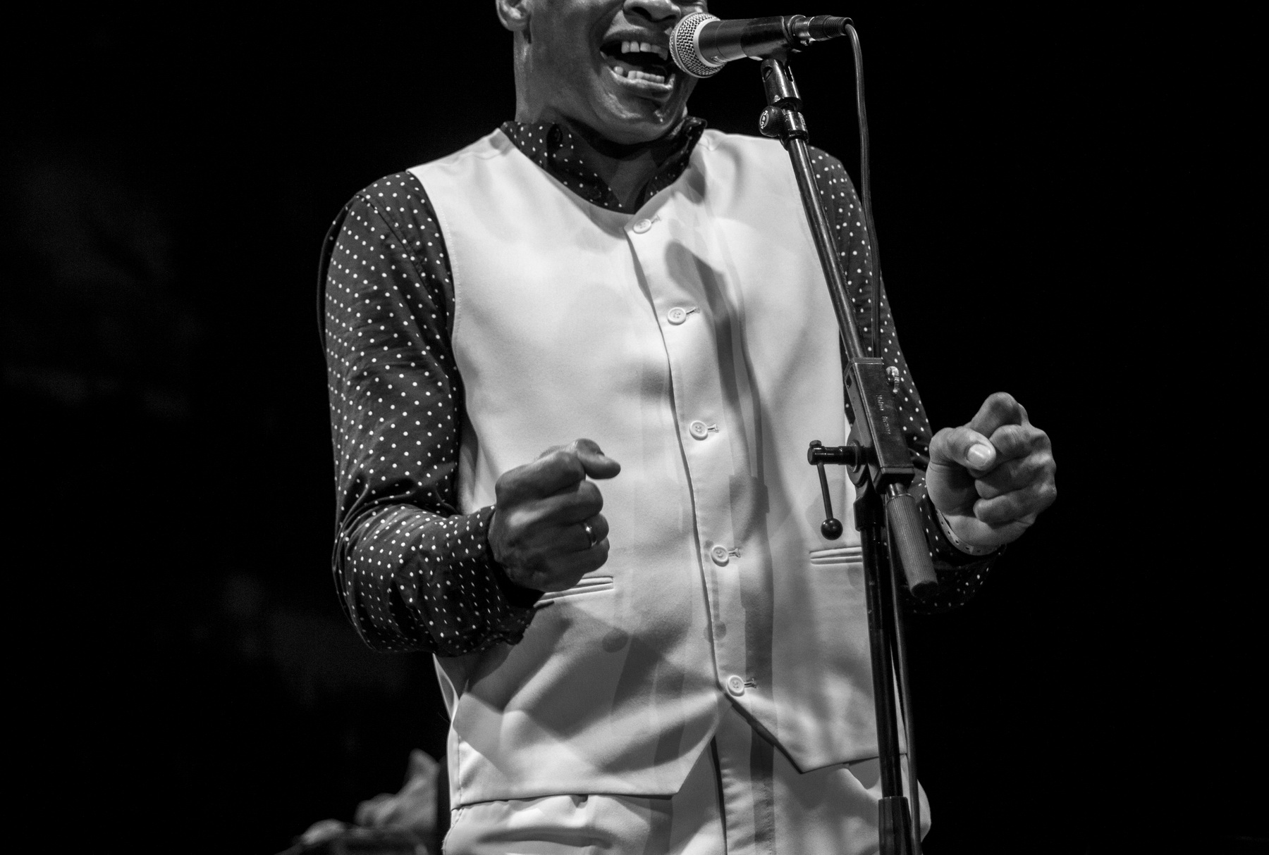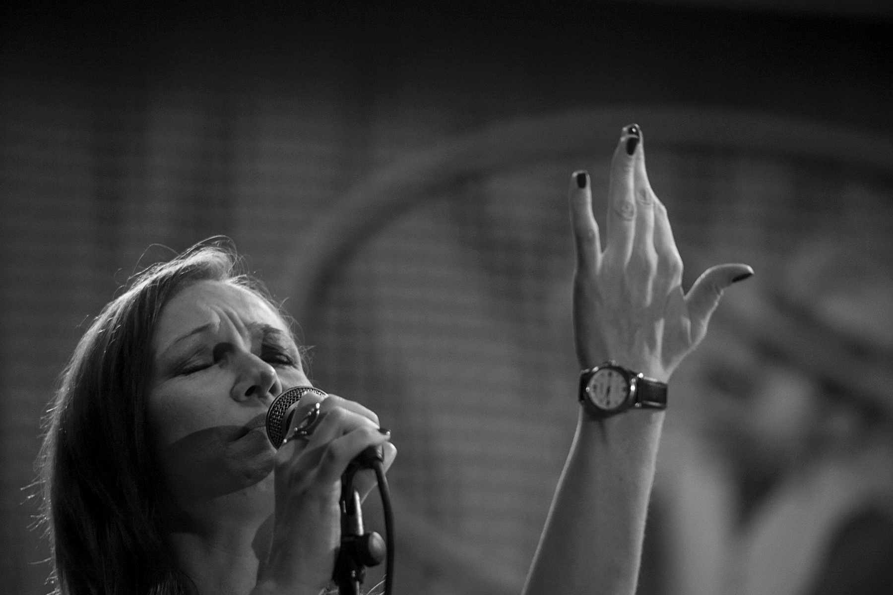 The set of black and white photographs emphasise emotion expressed both on large festival stages and in small smoky darkened clubs.